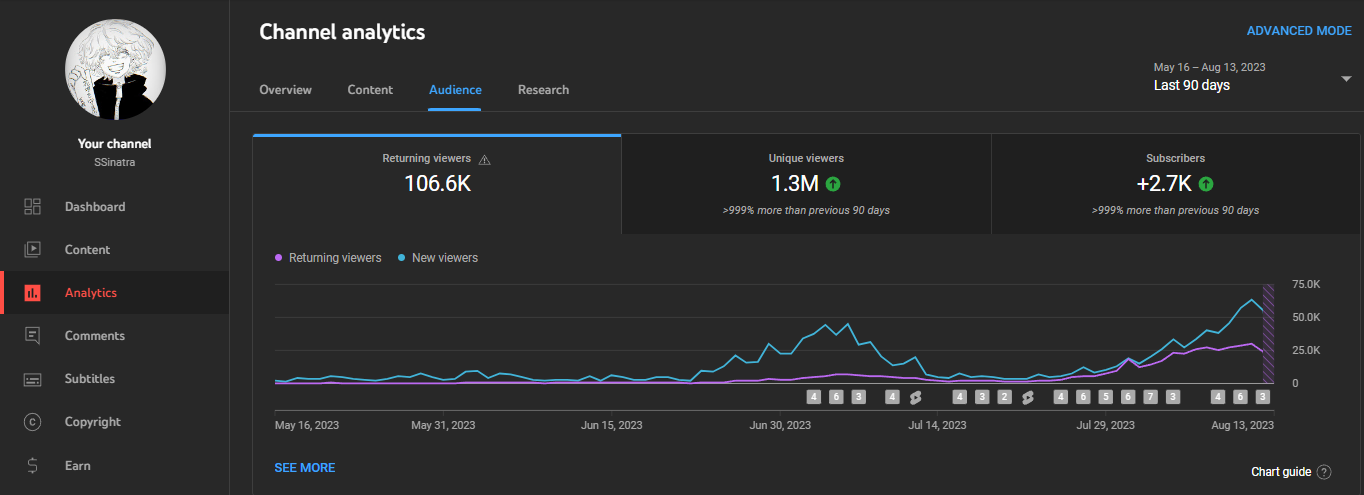 Additionally, it's evident that my content has reached over a million viewers, resulting in an average of slightly over 12.5% returning viewers. With each passing day, both of these metrics continue to rise, translating into a growing subscriber base as more and more viewers are drawn into and engaged with my channel.