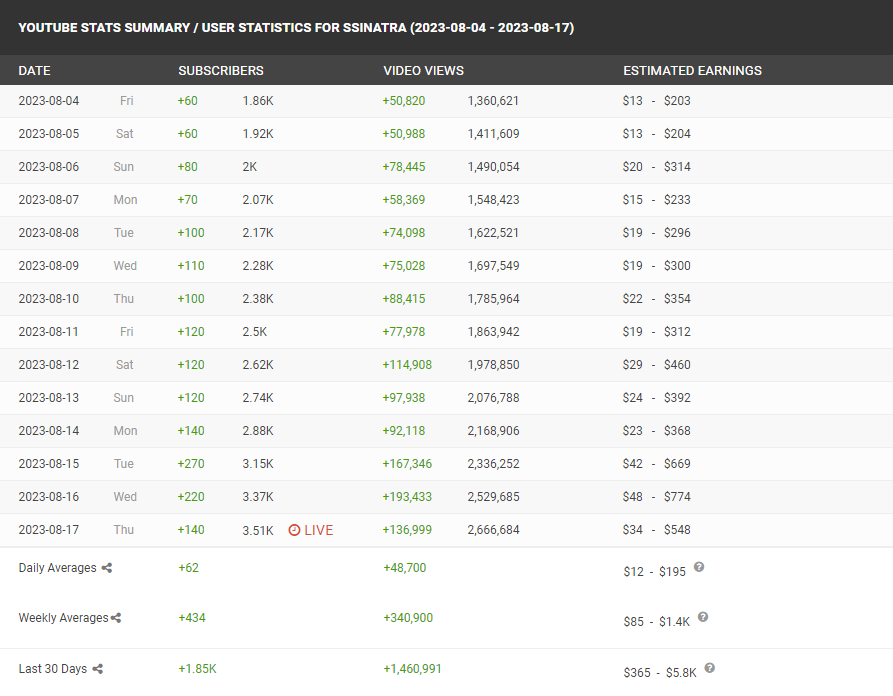 YouTube Growth from 08/04 - 08/17 | 2023