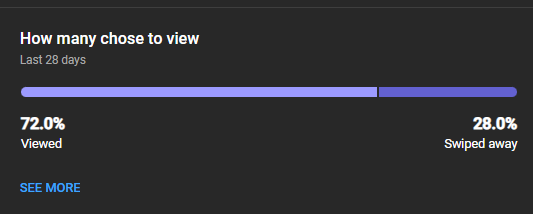 As I previously mentioned, each statistic tells its own story. This is evident in the way I've optimized my content to captivate viewers. The first image underscores that approximately 72% of my content effectively engages my audience, while only 28% choose to swipe away.
