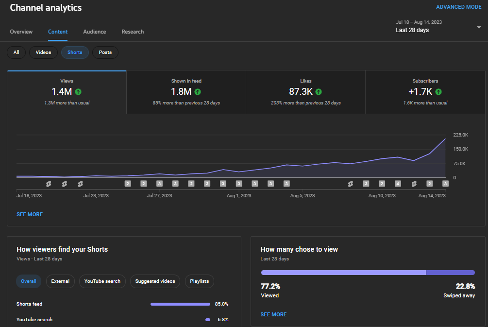 When developing content, my focus is on creating videos that instantly captivate the audience's attention. However, to establish a distinctive identity and stand out from competitors, I invest in assets that enhance the quality of my channels. For example, in earlier versions, my video intros lasted for two seconds, but upon implementation, I observed a negative impact on the "Swiped Away" metric. Recognizing this, I shortened the intro to just under one second, which resulted in improved metrics. To further optimize viewer engagement, I removed moments of silence and unnecessary transitions. These adjustments collectively led to a steady increase in the percentage of viewers who choose to watch my videos, elevating the rate from below 60% to an impressive average of 77.2%.