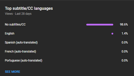 Moreover, I am dedicated to refining the technical aspects of video optimization. In the second image, you'll notice that merely 1.4% of my viewers watch with subtitles. During the early stages of my channel, this figure was around 3.8%. Recognizing that lacking captions alienated the hearing-impaired and segmented a specific demographic, I incorporated captions. This not only improved content quality for algorithm interpretation but also welcomed a new demographic previously untouched.